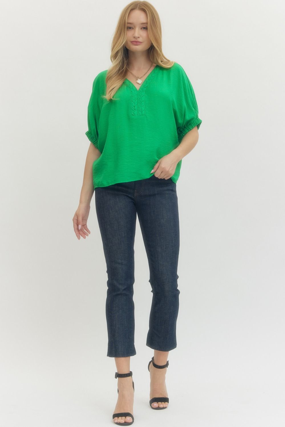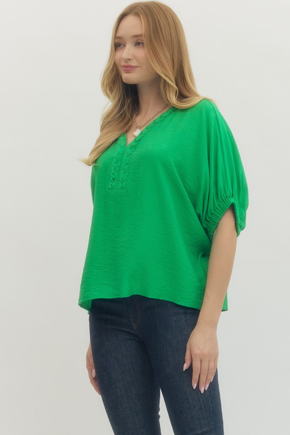 This vibrant green blouse features a relaxed fit, a flattering V-neck with subtle braided detail, and lightweight fabric that’s perfect for everyday wear. Easy to dress up or down Looks amazing with denim or white pants. Comfortable and polished